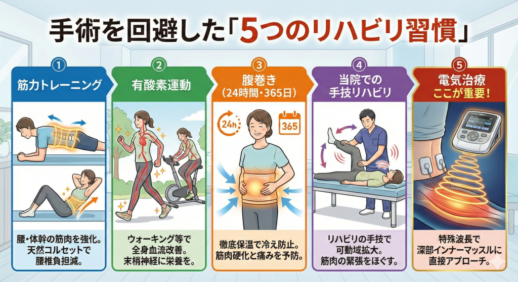 【院長が自ら実践】腰椎椎間板ヘルニア・脊柱管狭窄症の手術を回避した「5つの習慣」と「高機能・電気治療」の秘密